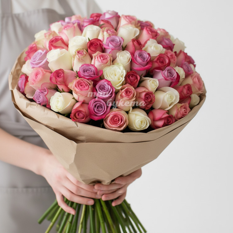 101 разноцв. роза в крафте (Premium)
