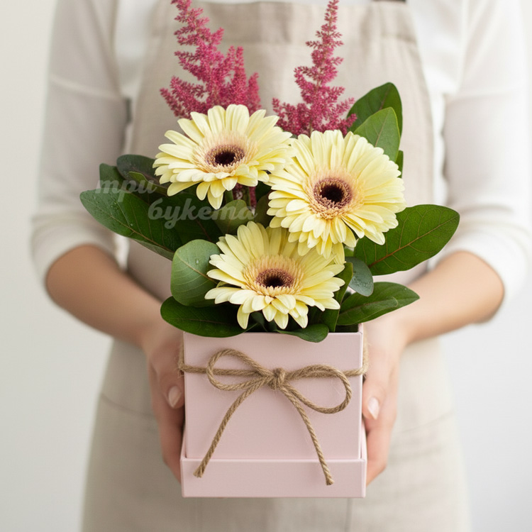 3 гербера в шляпной коробке