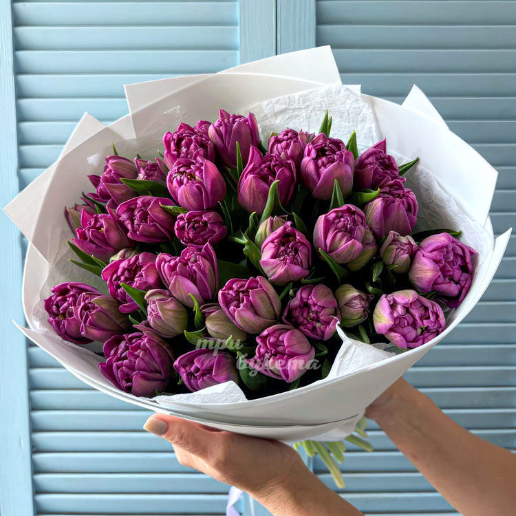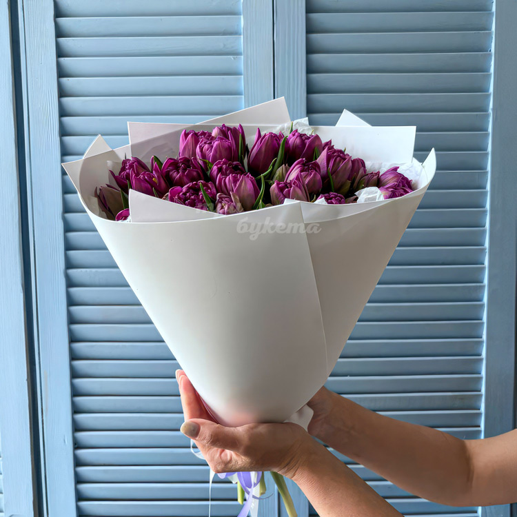 Букет 25 пионовидных сиреневых тюльпанов