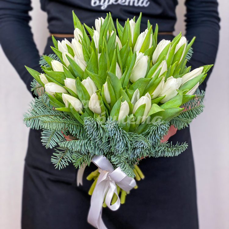 Букет из хвойных веток и тюльпанов