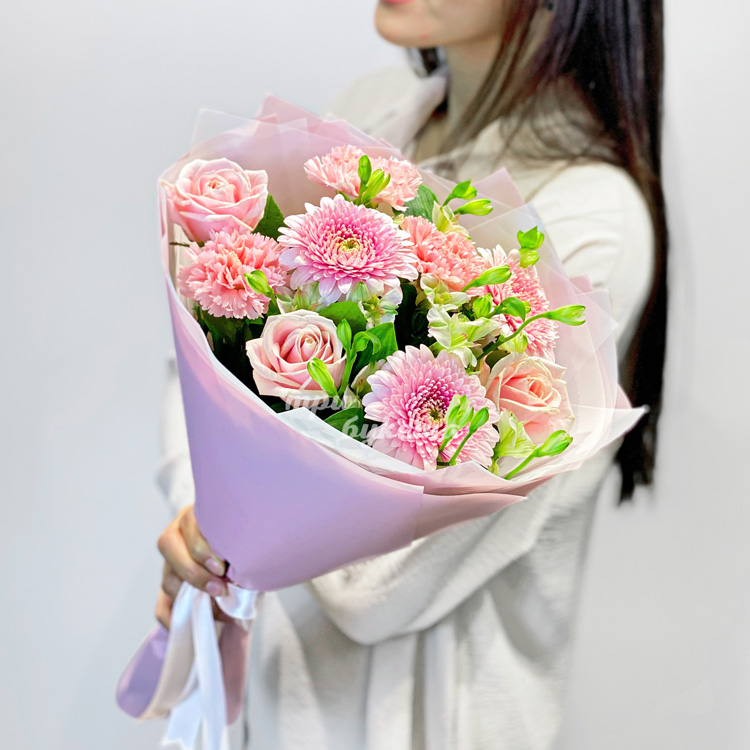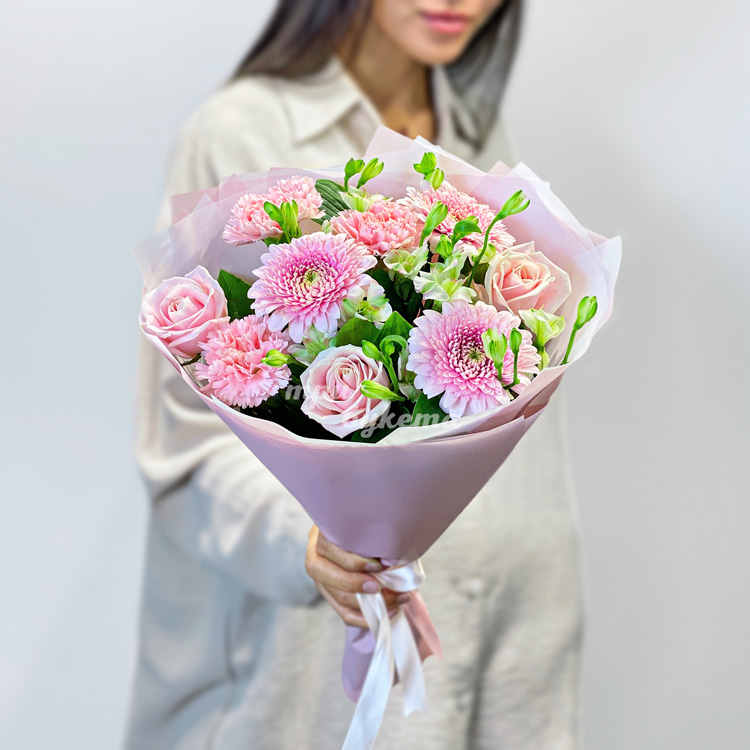 Букет розовых гербер, гвоздик и роз