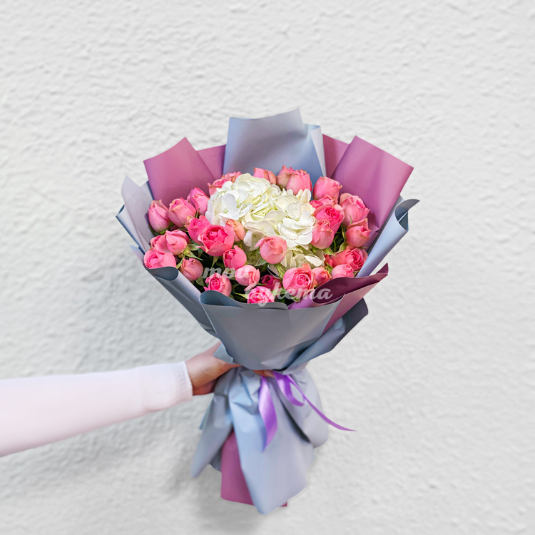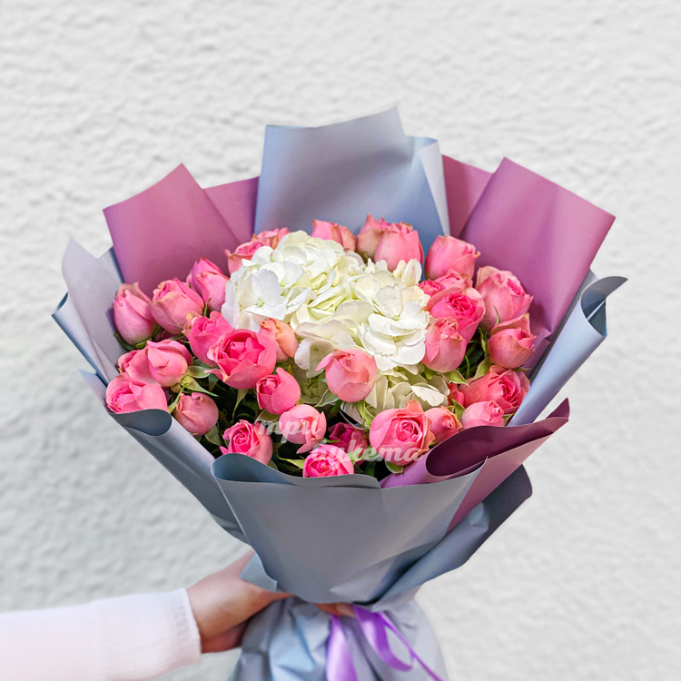 Букет розовых куст. роз с белой гортензией