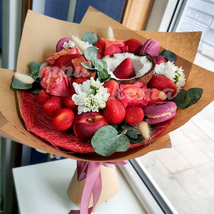 Букет с макарунами и клубникой