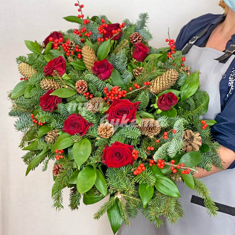 Композиция из роз и хвойных веток