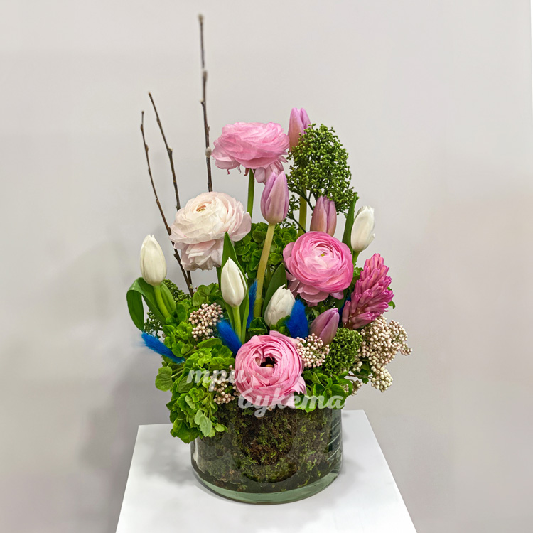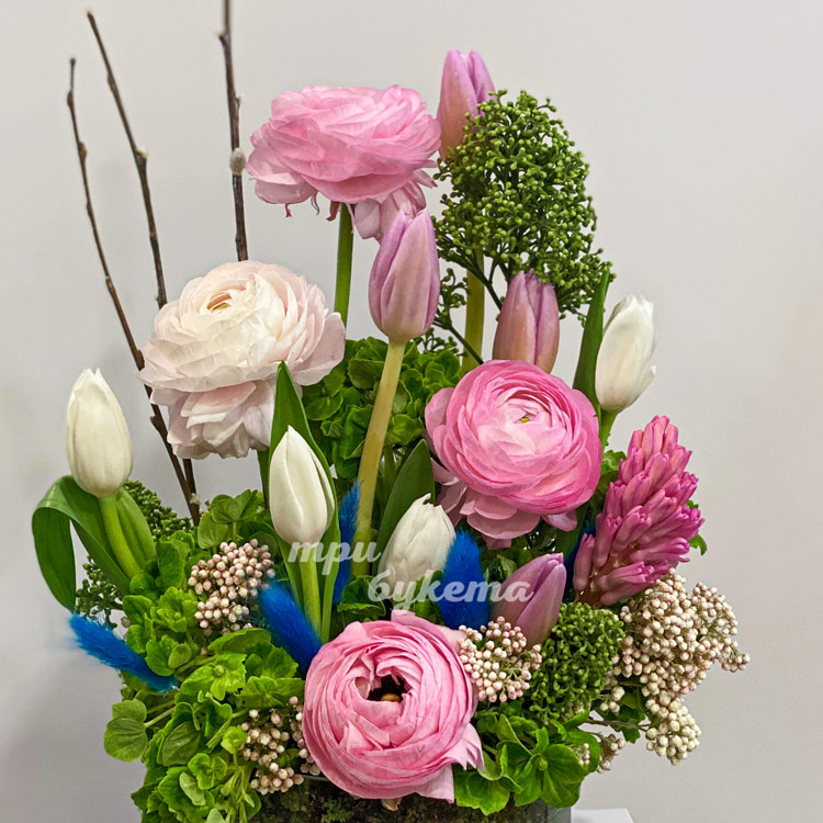 Композиция ранункулюсов и тюльпанов в вазе