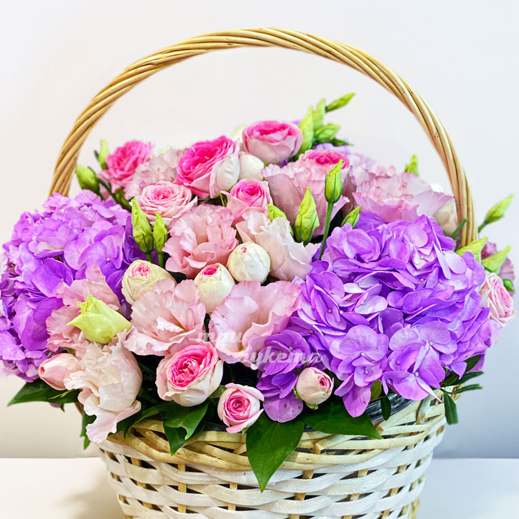 Корзина гортензий и роз