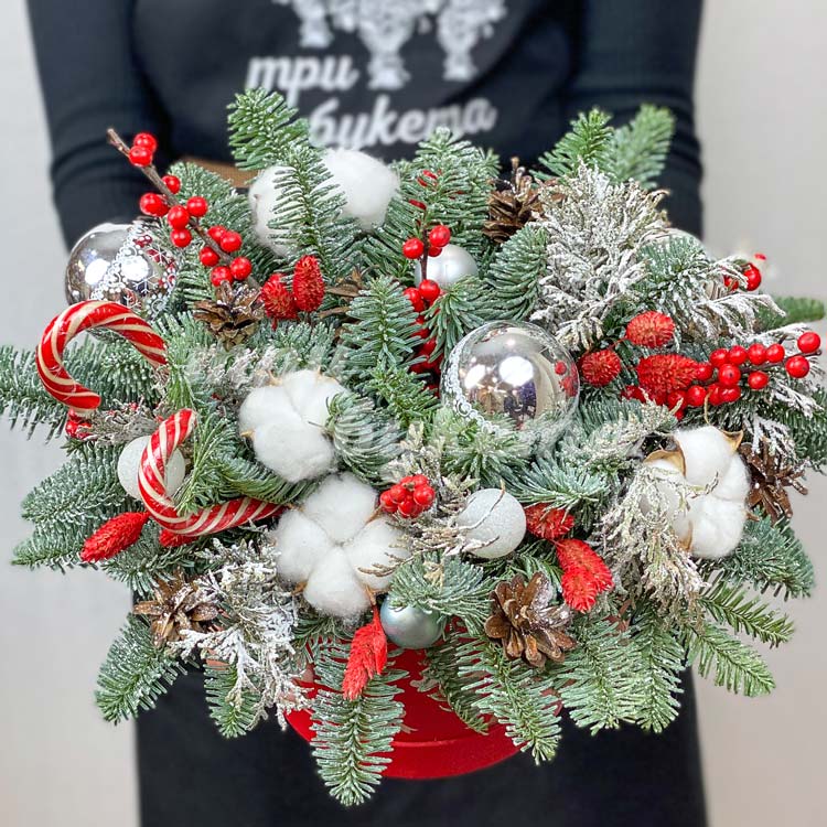 Леденцы и елочные игрушки в коробке