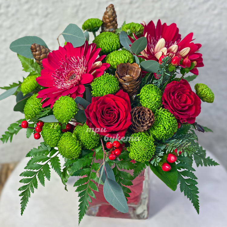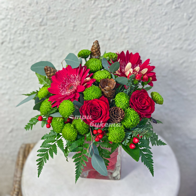 Новогодняя ваза с герберами и зеленью