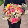 Персиковые пионовидные розы в коробке