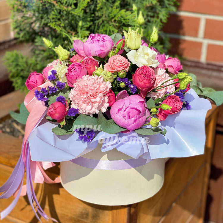 Пионы и пионовидные розы в коробке