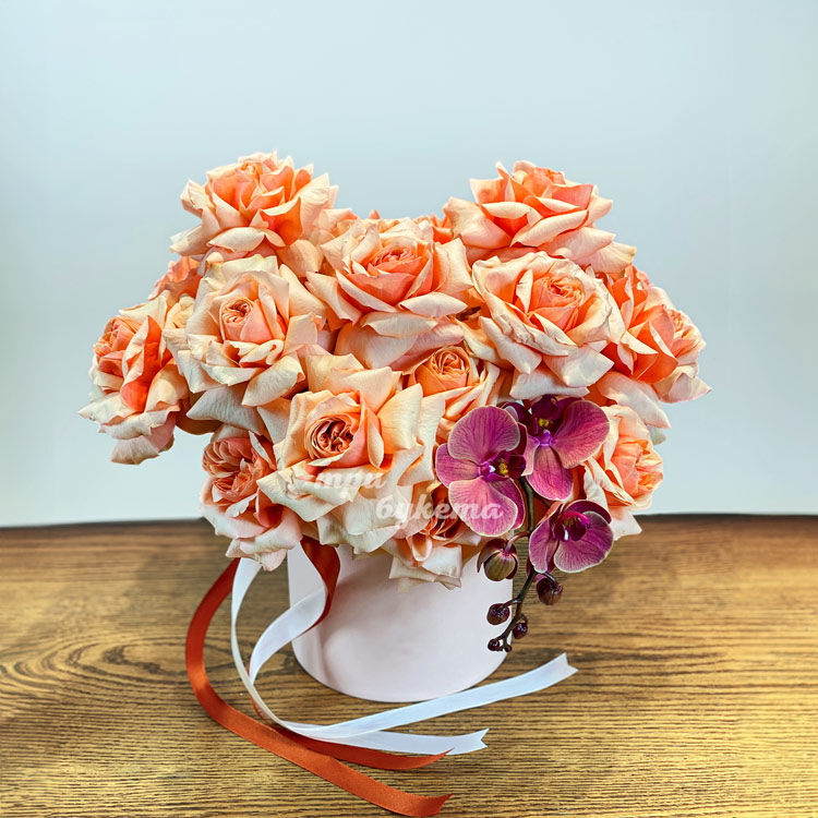 Шляпная коробка роз Шиммер с орхидеями