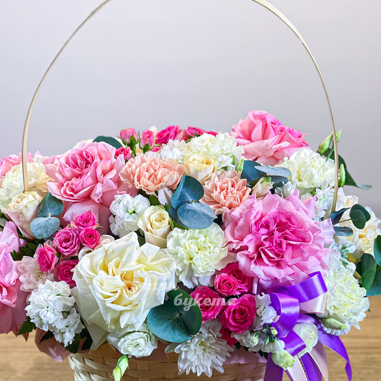 Яркая корзина гвоздик, роз и маттиол