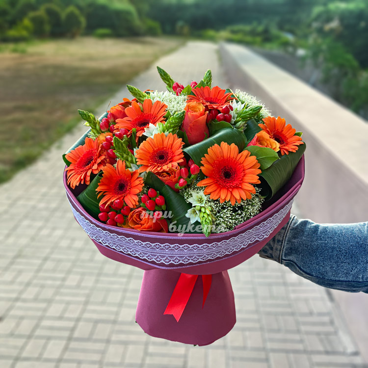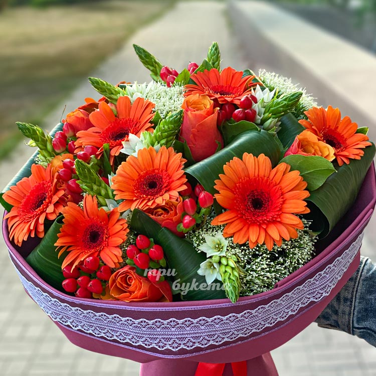 Яркий букет оранжевых роз и гербер